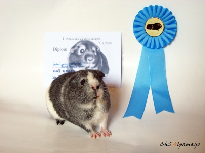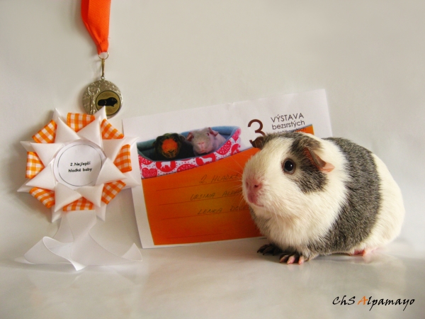 Tento rok jsem se sice výstav nijak zvláště neúčastnila – nebylo s čím, ale přesto si jedna morčinka vysloužila ocenění, a to Ursina Alpamayo, která representovala neobyčejnou barvu v plemeni hladké – aguti skořicová-bílá. Oceněna byla jako 2. nejlepší hladké morče v třídě baby.