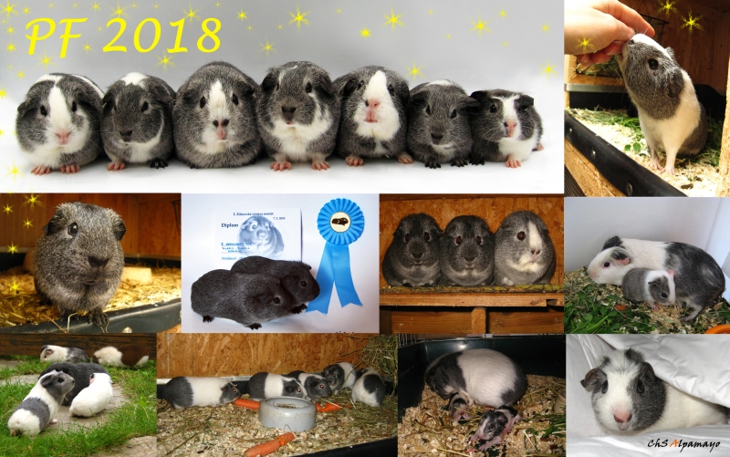 Nejprve bych chtěla zhodnotit uplynulý rok 2017, protože to byl krásný rok a s morčátky jsem si ho velmi užila. Tento rok byl ve znamení přilití nové krve díky půjčeným i pořízeným samcům a využití nově pořízených samiček z roku 2016. Noví samečci, kteří u mě působili byli Yshak DaMi a Asterix Eleonora, dále půjčení z ChS DaMi: Sarotto von der Alster a Filibert Z Chaloupky na mýtince, dále pak z ChS Austerlitz: Zamboo Austerlitz. Díky nim se narodilo několik nepříbuzných morčátek stříbro-bílých nebo s vlohami. Konečně se také rodila stříbrno-bílá miminka ze spojení obou rodičů z linie Alpamayo. Celkově se narodilo 15 vrhů s celkem 48 miminky. Počty byliy ve prospěch chlapečků, kterých se narodilo 25, holčiček bylo 23. Stříbro-bílých miminek se narodilo celkem 14 (hladká/crested), z nichž jsem si v chovu nechala 6 morčátek a k tomu ještě 2 krásné samičky solid aguti stříbrné s bílou. Mrtvé se narodilo pouze jedno mládě – samička. Porody proběhly v pořádku. Jediný problém nastal pouze u samičky Lambi ještě před porodem, u které miminka uhynula ještě v bříšku a samičku již nezachránila ani operace s kastrací, tudíž jsem o Lambi přišla.