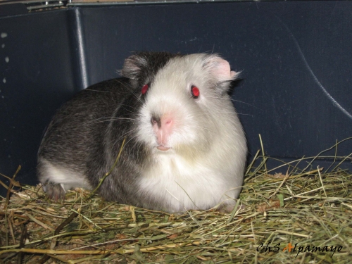 14. 9. 2014 - Bohužel musím vyřadit Arizonu z chovu. Má u očí vírky navíc. Moc mě to mrzí, protože jsem se těšila na stříbro-bílý vrh po ní a Eliášovi. Sehnat stříbrno-bílé morče je snad nemožné a odchovat si vlastní ještě nemožnější. Nějak se mi ty plány nedaří :(.